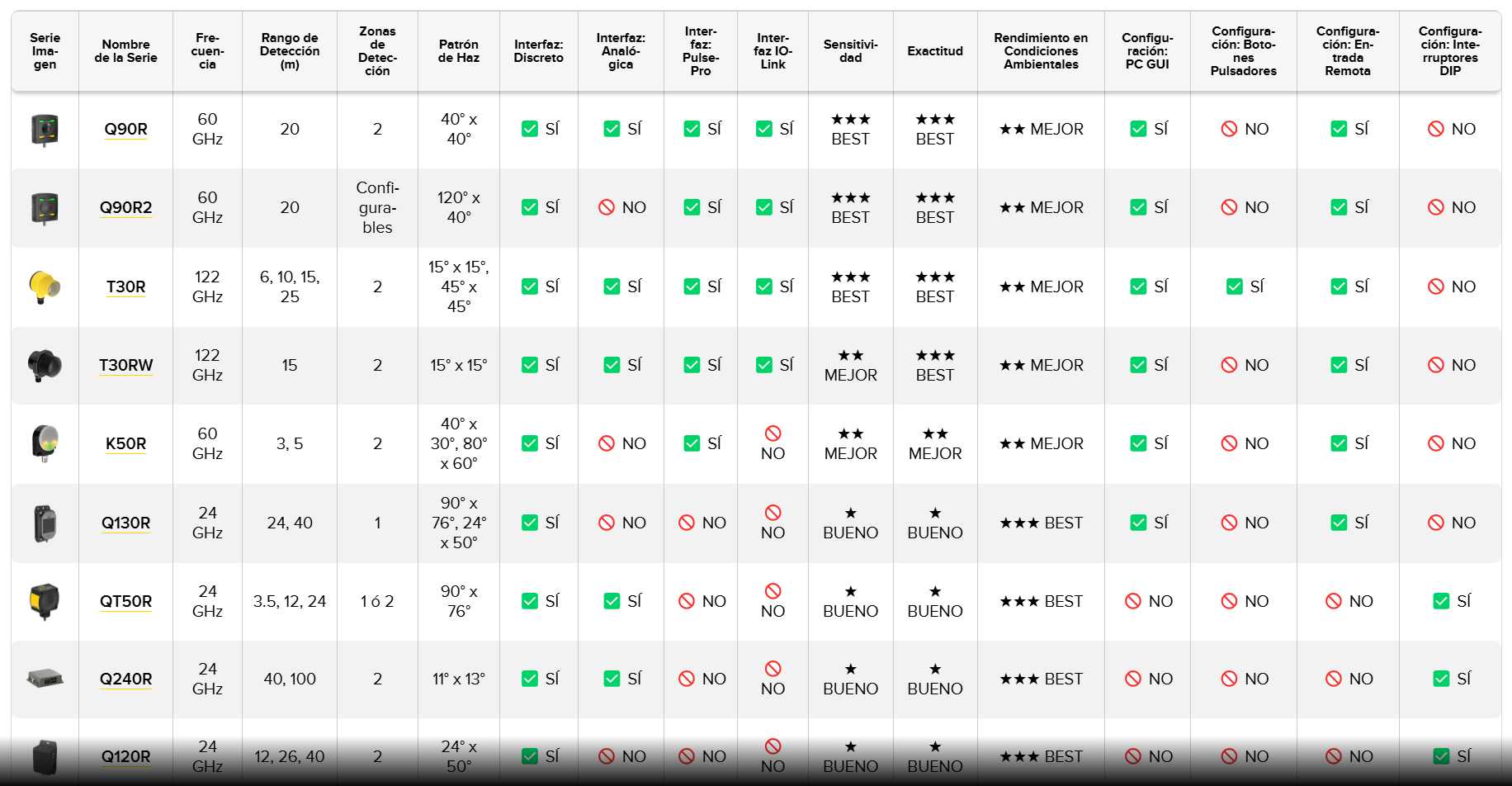 Los sensores de radar Banner utilizan tecnología FMCW para detectar objetos en movimiento o estacionarios con alta precisión. Son ideales para prevención de colisiones, posicionamiento y medición de niveles, funcionando de manera confiable en interiores y exteriores, incluso en condiciones climáticas extremas.